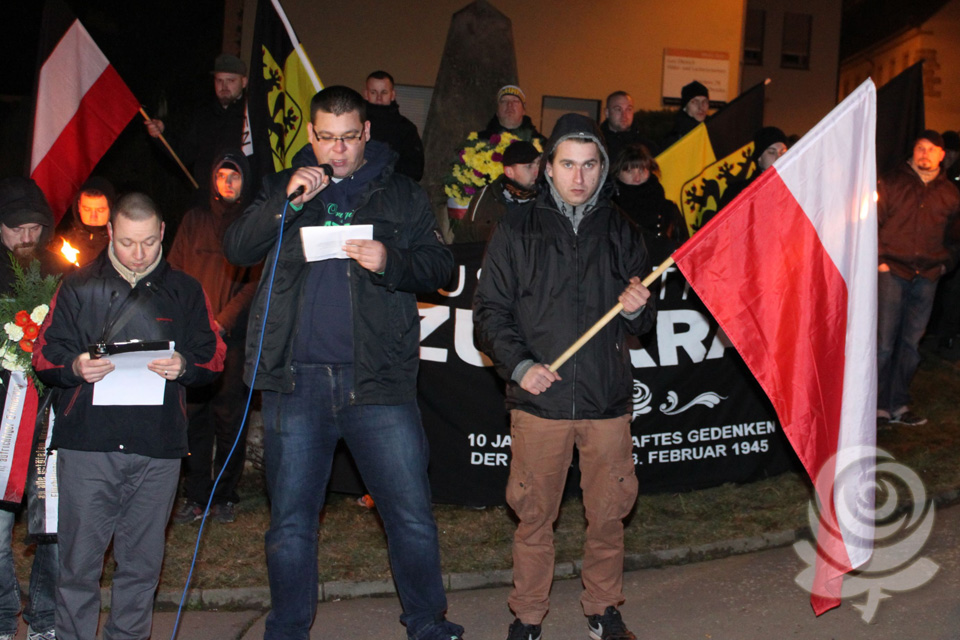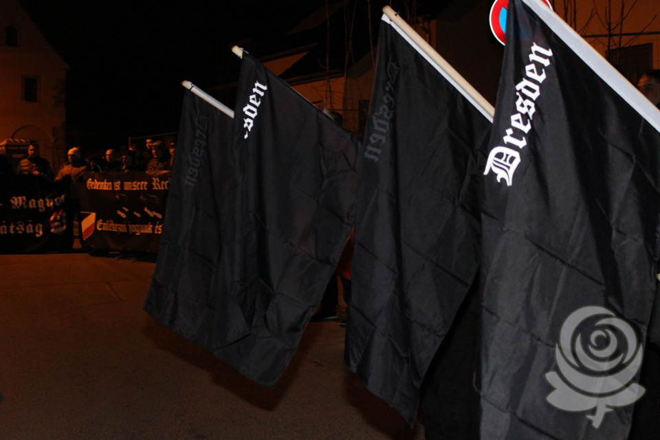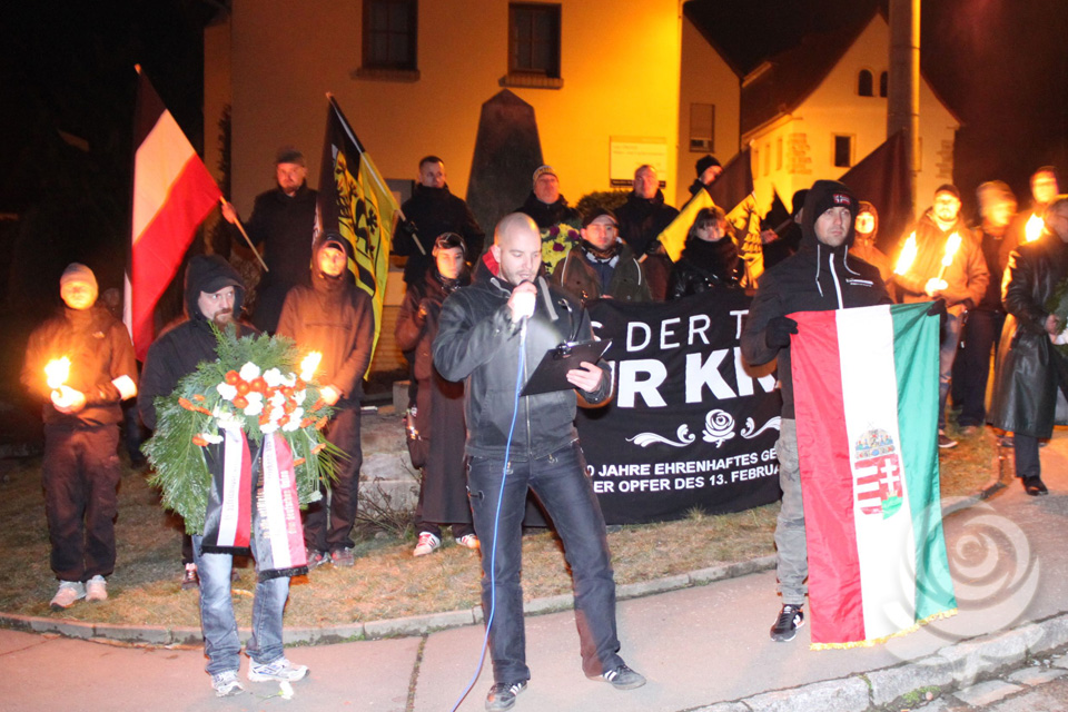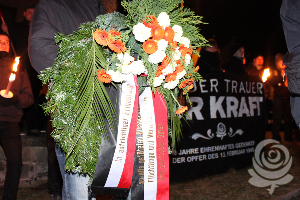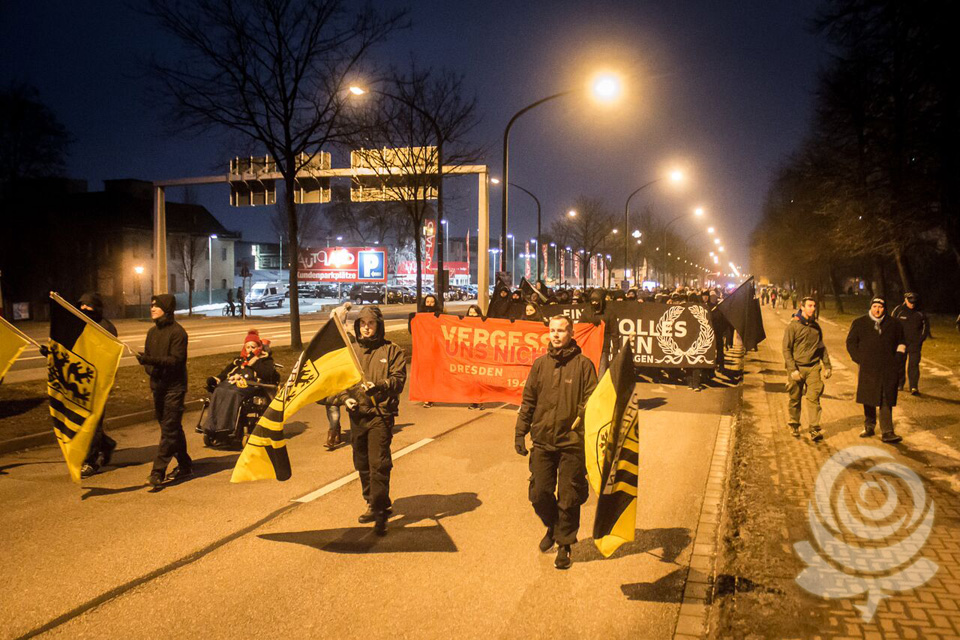 Es ist ein ruhiger Abend im Dresdner Osten, blickt man auf die vergangenen Jahre zurück. Gut 700 Teilnehmer haben sich in der Wilhelm-Liebknecht-Straße, im Stadtteil Dobritz, zum diesjährigen Dresden-Gedenken versammelt. Unter ihnen abermals Gäste aus Griechenland, der Tschechischen Republik, der Slowakei, Ungarn, der Schweiz und Polen. Kurz nach 19:00 Uhr setzt sich der Gedenkmarsch in Viererreihe, unter Fackelschein und begleitet von klassischer Musik in Bewegung. Eben so, wie es seit vielen Jahren in Dresden gute Tradition ist. Die Strecke durch ein großes Wohnviertel, wo Anwohner den vorbeiziehenden Menschen zuwinken und applaudieren, sich sogar selbst in den Trauerzug einreihen, führt zu einem Gedenkstein in Dresden-Nickern, den zeitgleich eine kleine Gruppe mit einer angemeldeten Mahnwache für den ankommenden Demonstrationszug besetzt hält. Die Sandsteinstele mit ihrem klaren Bekenntnis zur mahnenden Erinnerung der „Opfer des anglo-amerikanischen Bombenterrors“ noch deutlicher als bisher in den Gedenkmarsch mit einzubinden, ist eine klare und selbstbewusste Entscheidung der Organisatoren.